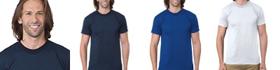 5.4 oz., 50% cotton, 50% polyester; Open-end yarn; Full cut; Shoulder-to-shoulder taping; Double-needle sleeve and bottom hems; Made in the USA;