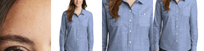 Washed chambray and off-white contrast stitching give this casual garment washed shirt an authentic, laid-back look.