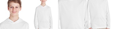 3.5 oz./yd2 / 130 gsm, 100% polyester interlock with moisture-wicking and uv pro; Team fit; Attached hood; Cationic dyes for superior brightness and excellent colorfastness; Transitioning from heat-seal label to tear away label. Inventory may be mixed;